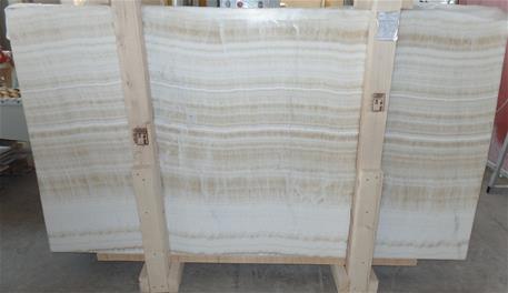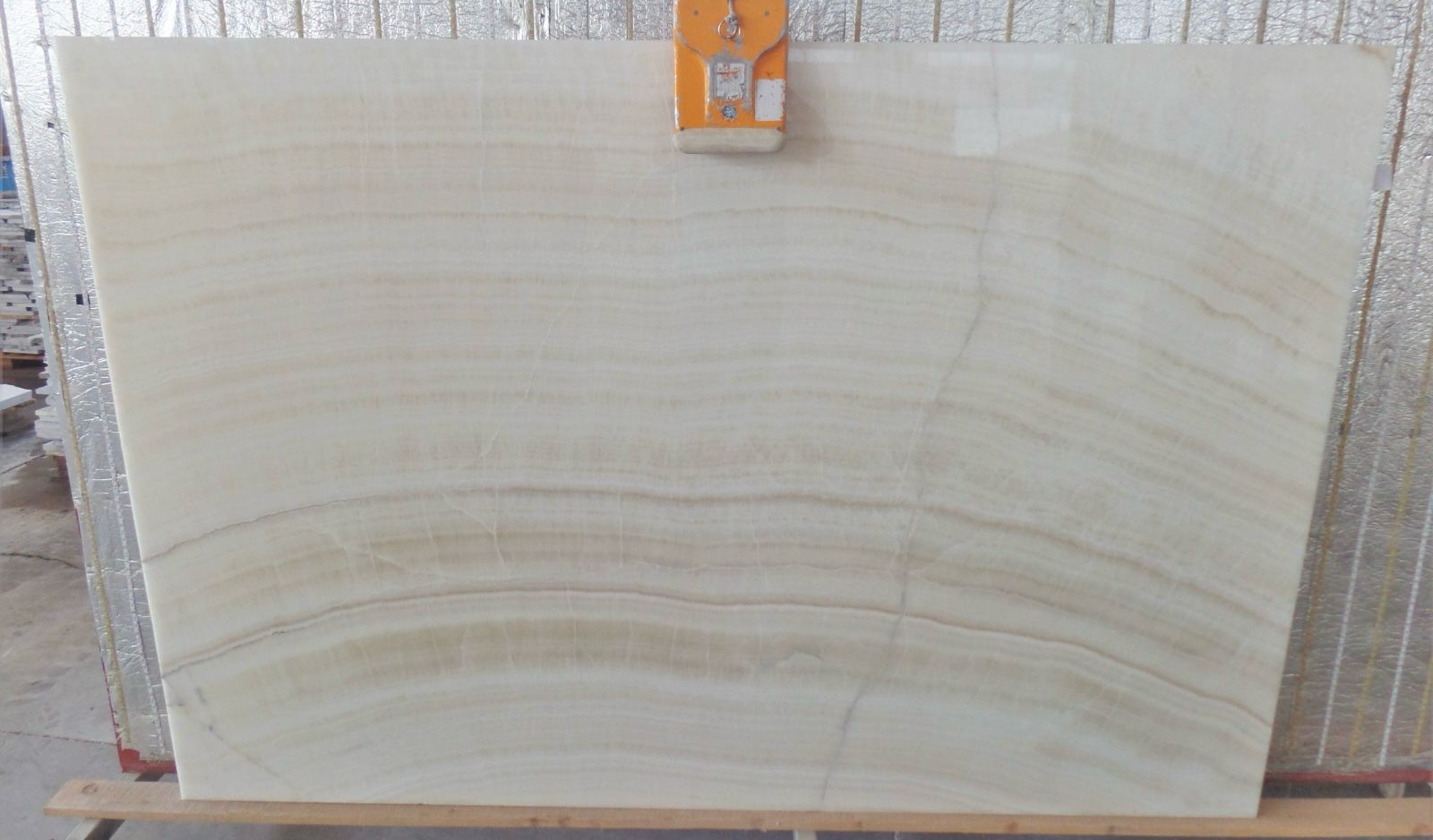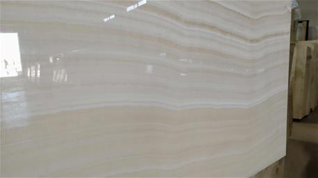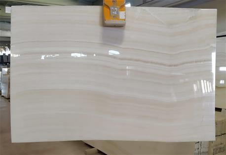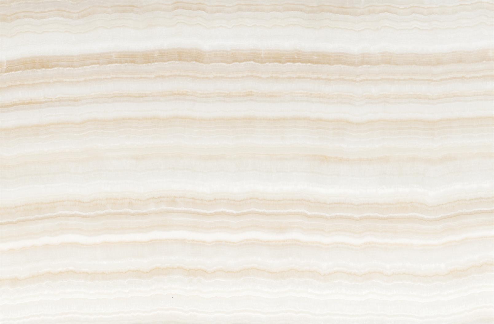 Royal White Onyx; quarried in Turkey; has a warm, milky white background crossed by light green/cream shades and veining. It can make any interior or exterior space look even more sophisticated and special whilst being able to retain its original simplicity and timeless look. By placing light behind it, Translucent Royal White Onyx creates matchless colour effects in any interior space in addition to its splendid visual properties. A common decorative technique used with onyx is the use of book-matching and polishing both sides of the slab creating a high gloss finish.